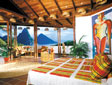 Extremley spacious and individually designed, some in a very open-air style with the fourth wall missing and some with dramatic open roof dormers. Some rooms have a formal separation between bedroom and living room, others are wide open spaces flowing into each other. Clay floor tiles or tropical hardwood floor, king size bed, wooden jalousie louvres, ceiling fans, balconies, and very large ensuite bathrooms with 2 sinks, shower and WC, Piton and/or Sea view. View Room Overview |